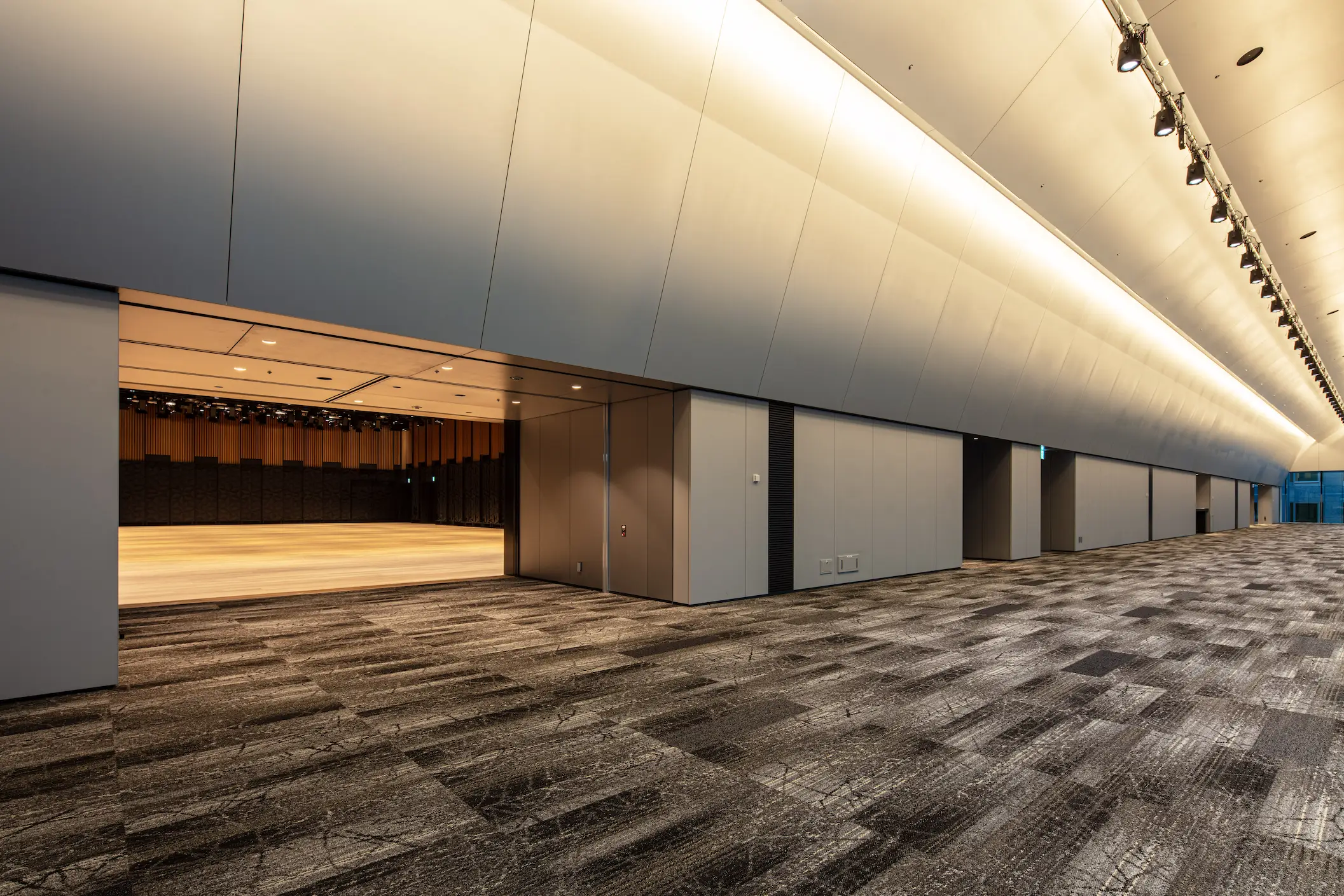 65mのホワイエと一体利用できる大型ホール。研修・全社会議・展示会まで幅広く対応可能です。