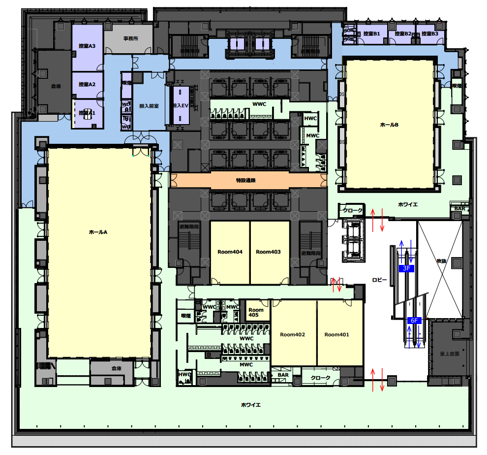 | Room401+402 | 102名 | 72名 | - | 約144.3㎡ | 約3.5m |