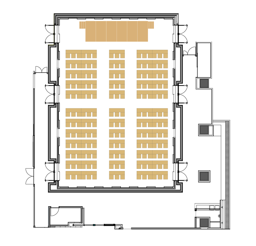 会場全体のレイアウトや動線、ステージ位置をご確認いただけます。用途に応じた設営や導線計画の検討にご活用ください。
